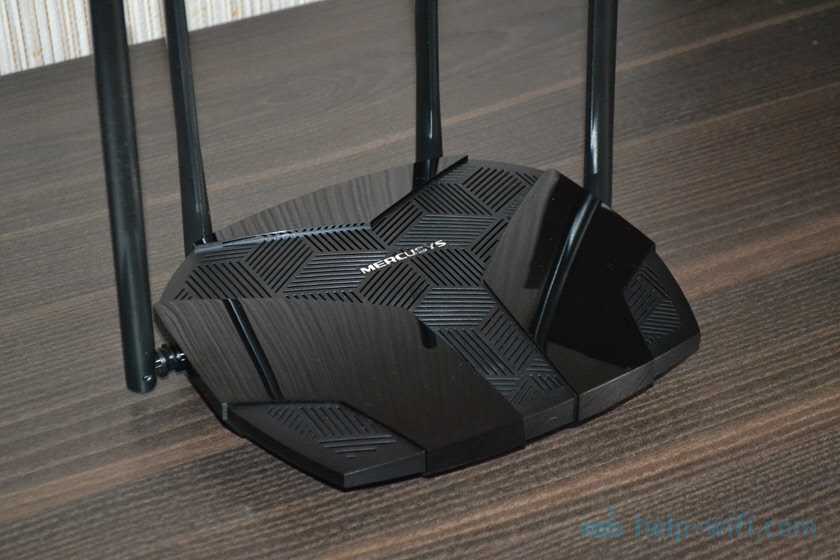 Сам роутер среднего размера. Полностью черный. Часть лицевой панели выполнена из матового пластика с отверстиями для вентиляции, а вторая часть из глянцевого пластика, который конечно же пачкается и царапается. Там же находится логотип компании Mercusys. Внешний вид мне очень понравился. Дизайн не скучный, и нет ничего лишнего.