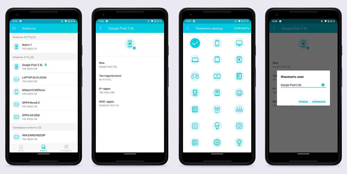 Во второй — список всех клиентов, разбитый на категории с типом подключения (проводное, 2,4 или 5 ГГц). Их можно переименовывать, менять иконки или вообще блокировать доступ к сети.