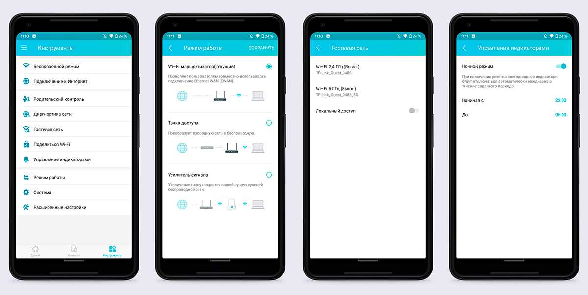 Ну и последняя — со всеми настройками: сети, родительского контроля, гостевой сети, управление индикаторами и выбор режима работы. Их немного, но всё основное можно делать. Для полнейшего контроля над TP-Link Archer A2 — используем веб-версию панели управления.