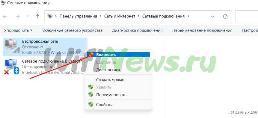 Если Wi-Fi пропал и соединение не активно, его иконка имеет сероватый оттенок. В таком случае нужно выбрать его левым кликом мыши, затем нажать правую кнопку и в выпадающем меню выбрать «Включить».