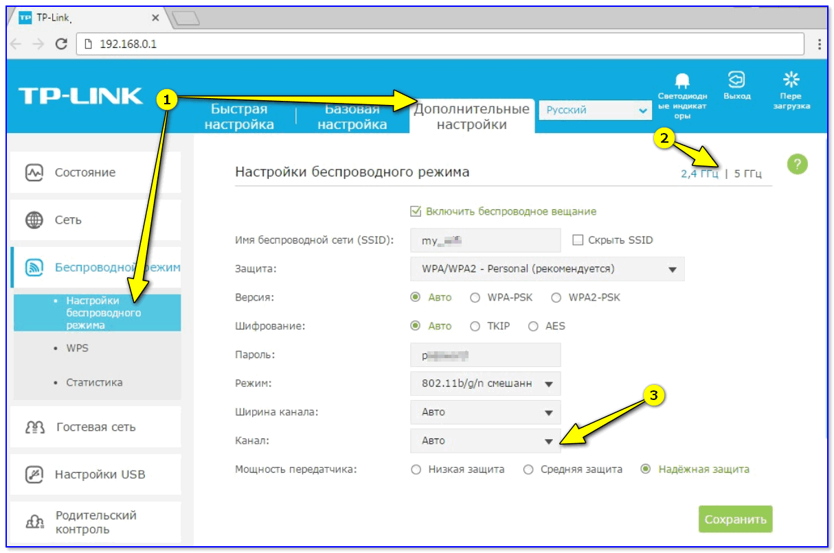 Чтобы вручную сменить канал — необходимо зайти в настройки роутера, открыть раздел беспроводных настроек, выбрать частоту (2,4 или 5 GHz) и указать требуемый канал (это в общем случае). На скринах ниже показано как это делается для роутера TP-Link, Tenda и Comfast.
