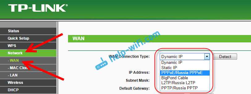 2. Если все подключено правильно, то проверяем настройки. Зайдите на страницу настроек своего роутера (как это сделать, писал выше). Перейдите на вкладку Network – WAN. Выберите в списке нужный тип подключения, и заполните необходимые поля.