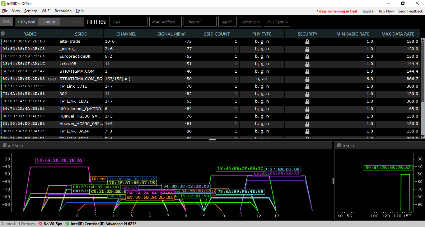 Запустив программу, видим — какой канал использует каждая из доступных сетей. Соответственно, можем оценить их загрузку и выбрать наиболее свободный. Пользоваться подобными программами можно и для поиска оптимального места размещения точки Wi-Fi. Для этого нужно запустить InSSIDer на ноутбуке и пройтись с ним по дому. Наблюдая за параметрами соединения можно понять, из какого места сигнал роутера мощнее и где находятся «мертвые зоны», не подходящие для обустройства рабочего места.