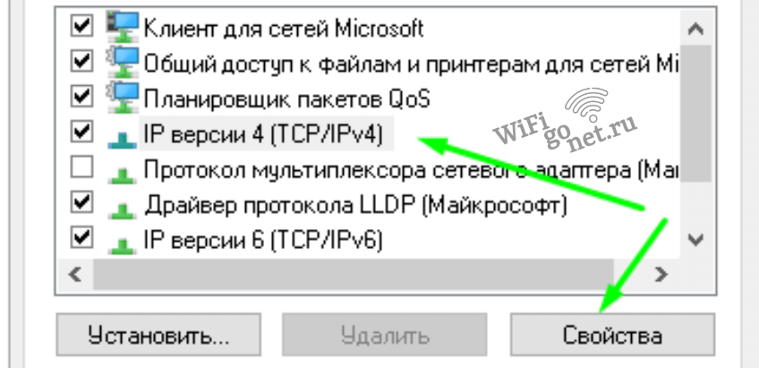 - Откройте свойства беспроводной линии. Если рядом с IP 4 нет галочки, поставьте ее. Сохранять.