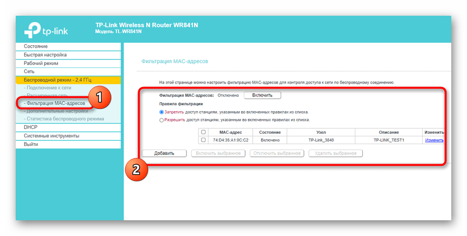 Фильтрация MAC-адресов дает возможность установить ограничения или создать белый список из пользователей, которые могут подключаться к добавленной сети. Настройки точно повторяют те, что доступны и для главного роутера.
