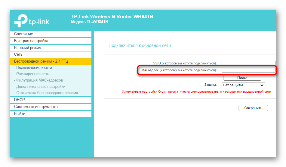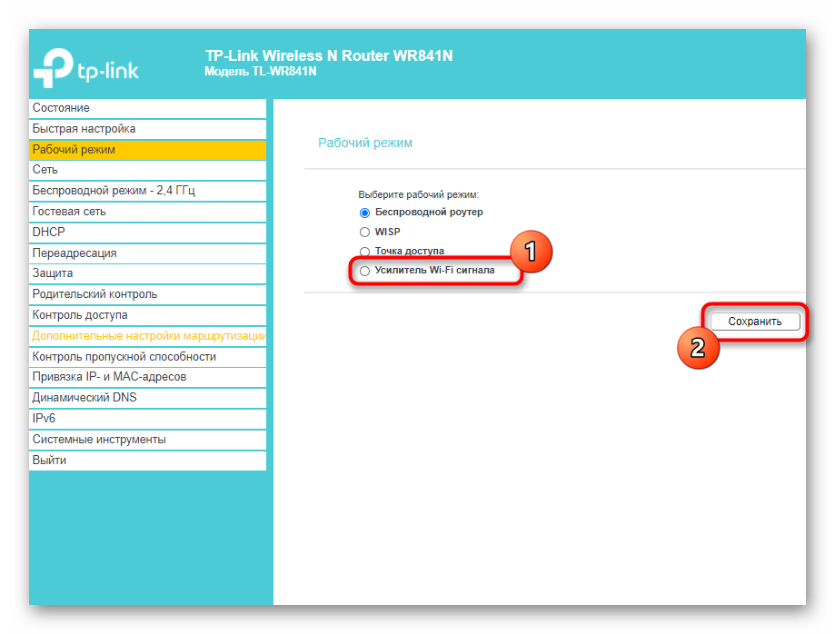 Сначала затронем основные параметры, которые понадобится выставить для корректной работы TP-Link в режиме повторителя. Если вы еще не знаете, этот режим подразумевает подключение к уже существующей сети Wi-Fi, раздаваемой от маршрутизатора любой модели, с дальнейшим расширением зоны покрытия. Включается он следующим образом: