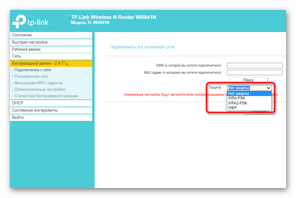 Разверните выпадающее меню «Защита» и выберите протокол, используемый существующей беспроводной сетью.