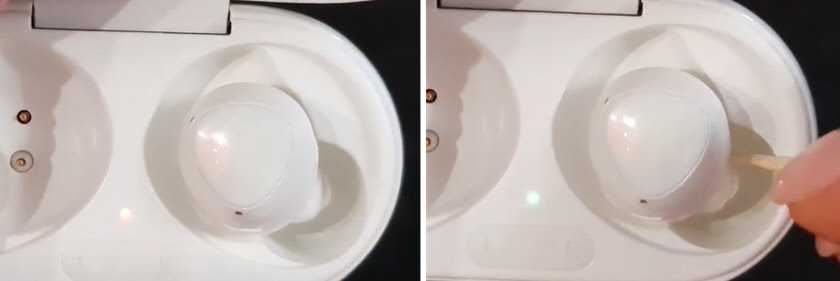 - Дальше ставим в кейс проблемный наушник. Он сразу начинает заряжаться (индикатор на кейсе красный) и тут же перестает (индикатор горит зеленым) . Это вы можете увидеть на фото выше.