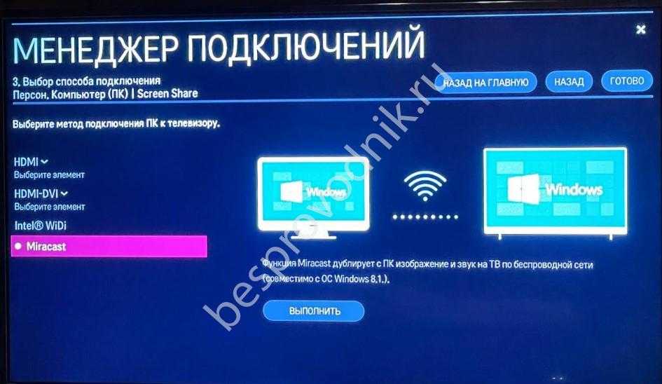Беспроводное подключение ноутбука к телевизору LG через WiFi возможно также с помощью опции Miracast. Главный плюс этого варианта в том, что Вы можете не только воспроизводить файлы, но и дублировать экран. Но начать нужно с того, что подключить оба устройства к одной сети интернет по Вай-Фай либо посредством кабеля Ethernet (предпочтительный и более стабильный вариант).