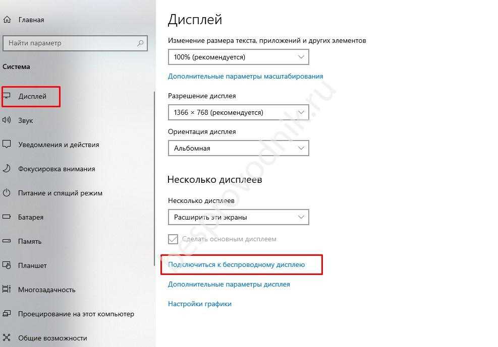 В разделе «Дисплей» пролистайте вниз до строки «Подключиться к беспроводному дисплею»;