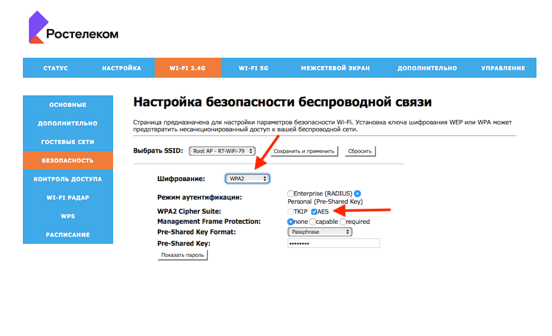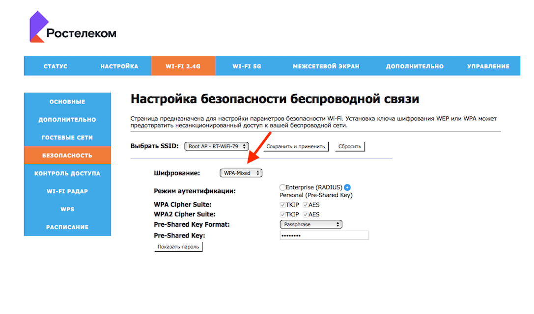 - Изменить протокол шифрования WPA2/WPA на WEP.