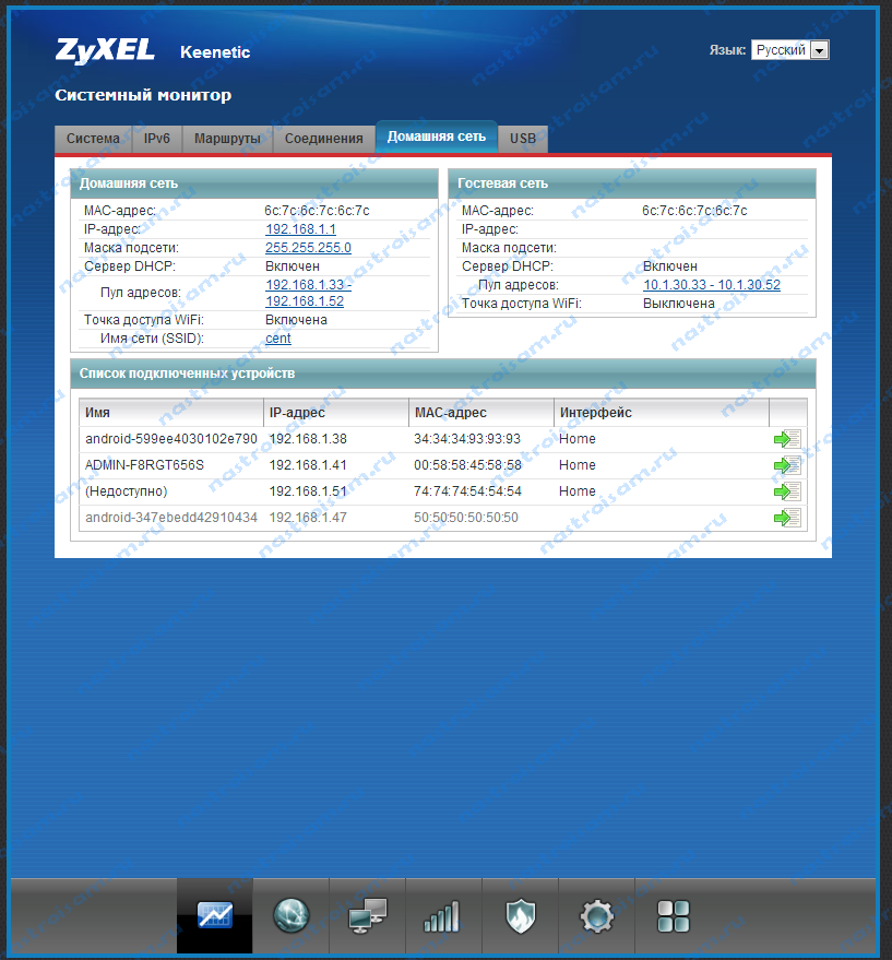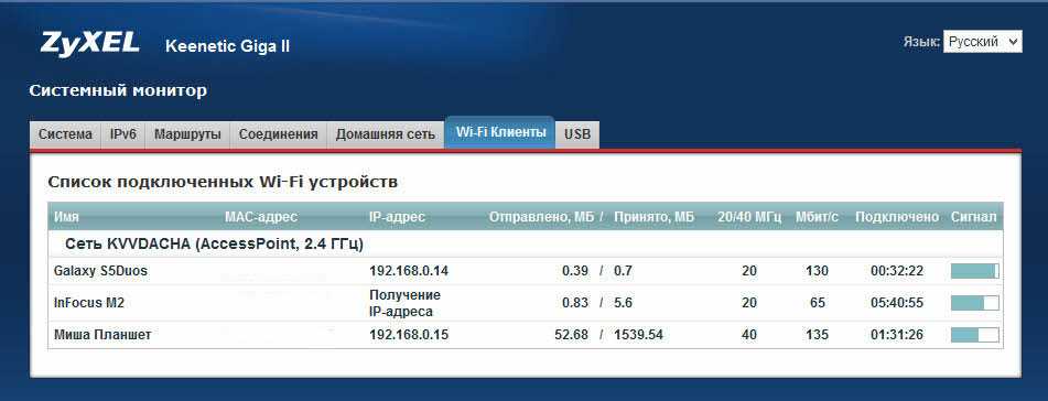 Я буду рассматривать новый интерфейс NDMS v2, которой прошиты все последние партии старых роутеров Zyxel Keenetic и новых Keenetic II. Чтобы посмотреть подключенных клиентов сети WiFi надо открыть первый раздел — «Системный монитор» и в нем найти закладку «Домашняя сеть». В нижней части страницы смотрим таблицу «Список подключенных устройств».