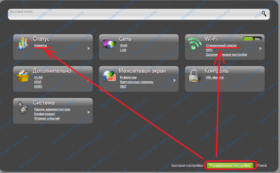 После входа в веб-интерфейс настроек D-Link, внизу страницы нажмите пункт «Расширенные настройки». Затем, в пункте «Статус», нажмите на двойную стрелку вправо, пока не увидите ссылку «Клиенты». Нажмите по ней.