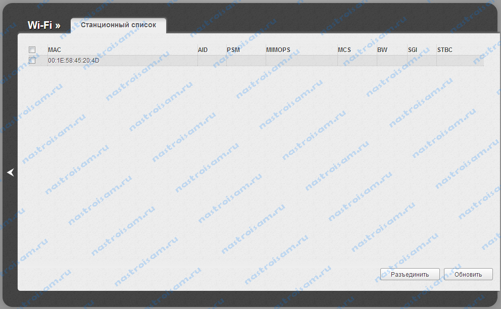 Практически на всех современных моделях этого производителя так же используется единый стиль веб-интерфейса. Узнать кто подключен к сети WiFi роутера можно в Расширенных настройках в разделе «Статус» > «Клиенты или Wi-Fi» > «Станционный список». Последний вариант предпочтительней, так как можно сразу отключить злоумышленника, поставив галочку рядом с его MAC-адресом и нажав кнопку «Разъединить».