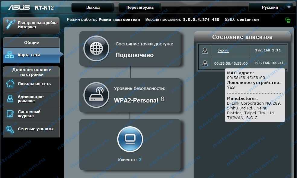 На роутере Asus найти список клиентов легче всего. На этой странице сможете проверить, кто подключен к wi-fi роутеру, также отображается дополнительная информация о Wi-Fi (состояние, тип шифрования):