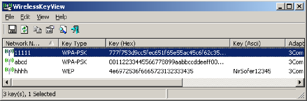 После загрузки утилиты в её окно отобразятся все сохранённые ключи безопасности в ASCII-виде и шестнадцетиричном представлении вместе с типом шифрования.