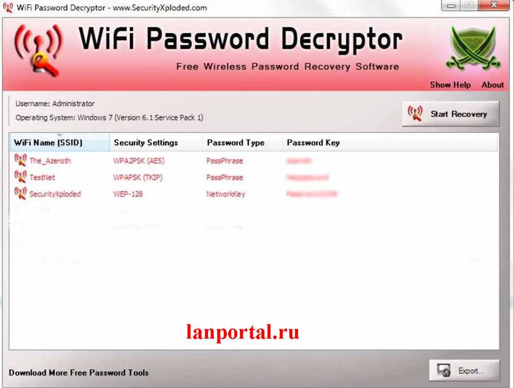 Пользоваться данной утилитой очень просто, клацаете «Начать восстановление». За считанные секунды WiFi Password Decryptor покажет SSID и password.