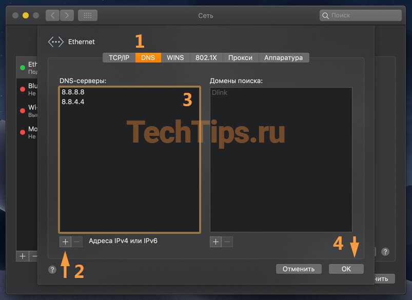 Чтобы прописать адреса DNS-серверов нажмите «Дополнительно», выберите «DNS», нажмите + в поле «DNS-серверы». Нажмите «ОК», затем «Применить».