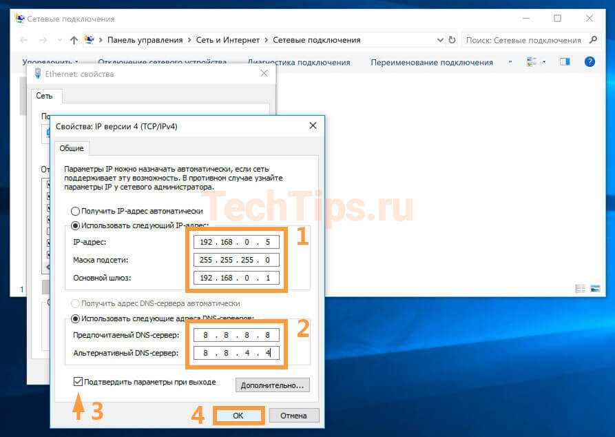 Если у вас есть адреса DNS-серверов — вписывайте их, в остальных случаях можно воспользоваться публичными DNS Google: предпочитаемый DNS-сервер — «8.8.8.8», альтернативный — «8.8.4.4». Поставьте галочку на пункте «Подтвердить параметры при выходе», итоговые настройки: