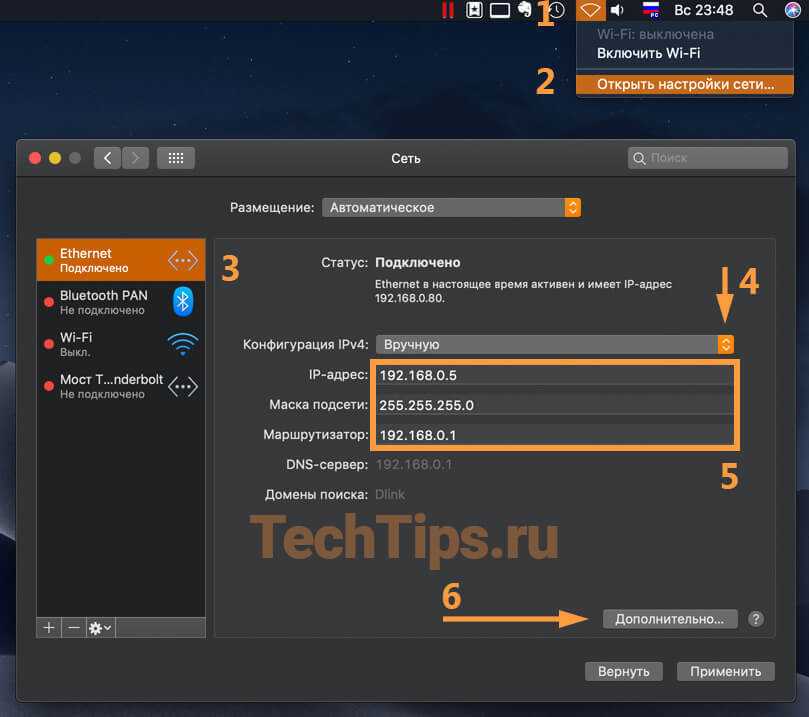 Общий алгоритм расписан выше, здесь кратко покажу куда зайти, чтобы изменить параметры сетевой карты на macOS.