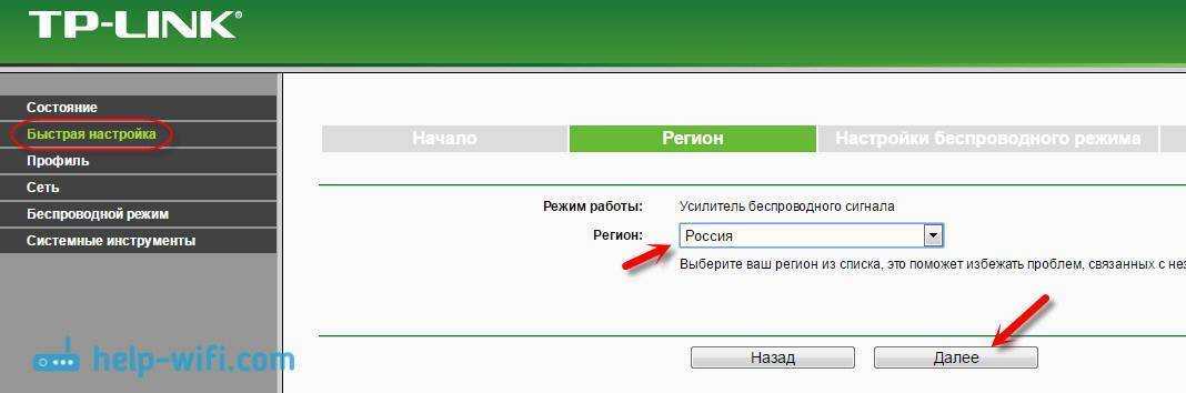 Есть такие маршрутизаторы, на которых нет кнопки WPS. В таких случаях, ретранслятор можно настроить вручную, лучше всего через мастер быстрой настройки. В панели управления перейдите на вкладку “Быстрая настройка”, и нажмите кнопку “Далее”.
