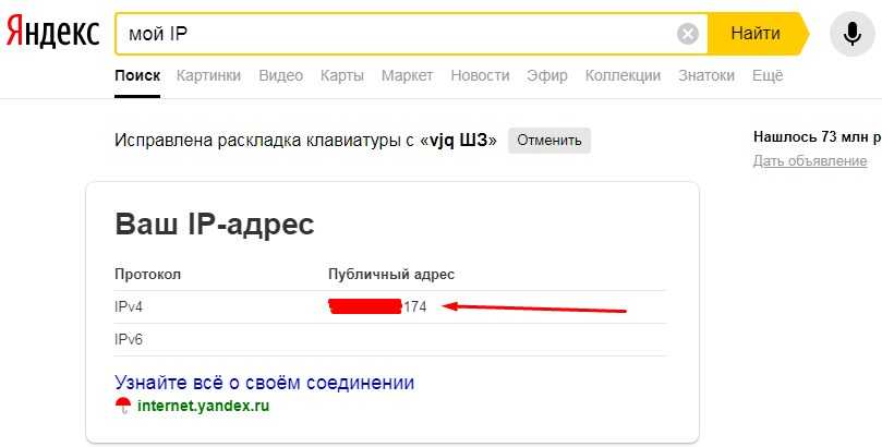- Теперь давайте проверим наше соединение. Нам нужно узнать внешний «Айпишник». Для этого в поисковике вводим «мой IP» и запоминаем адрес.