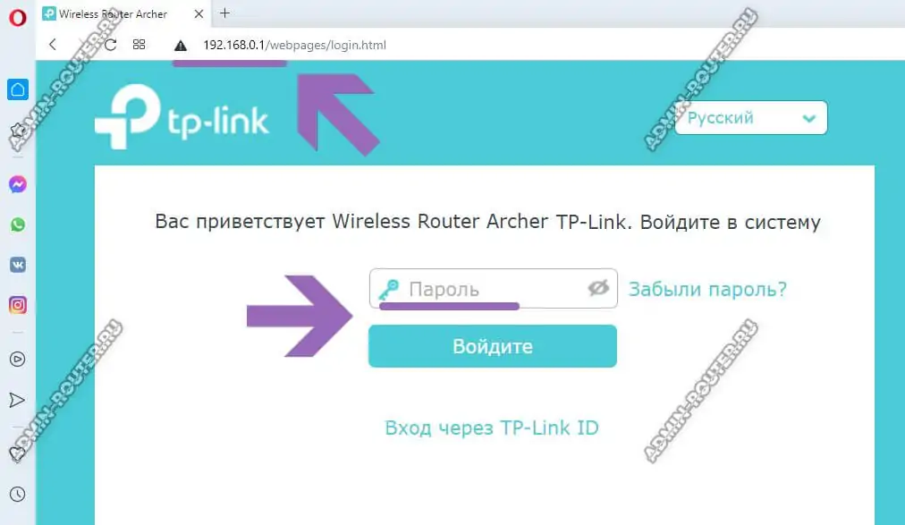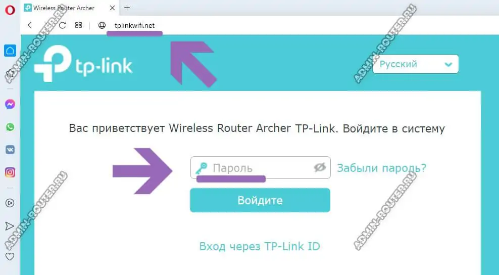 Итак, для того, чтобы зайти в настройки Вай-Фай маршрутизатора с обычного компьютера или ноутбука, которые мы предварительно уже подключили к его локальной сети, Вы должны запустить обычный веб-браузер и набрать в нём адрес своего роутера, который написан на наклейке. Я буду показывать на примере популярной модели TP-Link Archer. Соответственно вводим адрес tplinkwifi.net, вот так: