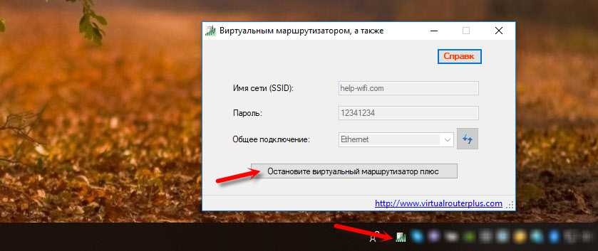 Все окна станут неактивными и появится кнопка Stop Virtual Router Plus (с ее помощью можно отключить виртуальный Wi-Fi). Вы можете свернуть программы, и они скроются на панели уведомлений (внизу справа).