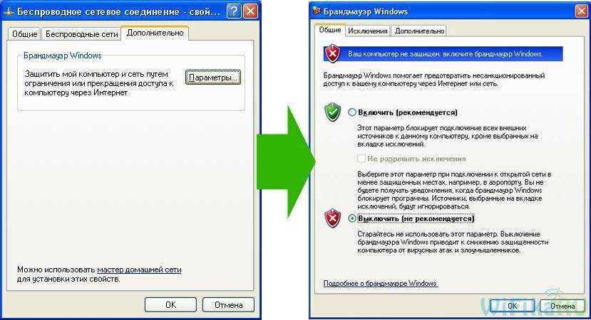 После этого переходим на вкладку «Дополнительно», жмем на кнопку «Параметры» и отключаем брандмауэр, чтобы он не блокировал раздачу с основного ноутбука интернета на другой комп.