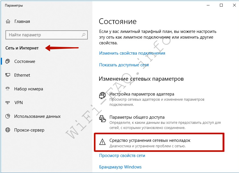 В ОС Windows предусмотрен инструмент поиска неисправностей. Его можно запустить через «Параметры» в разделе «Сеть и интернет».